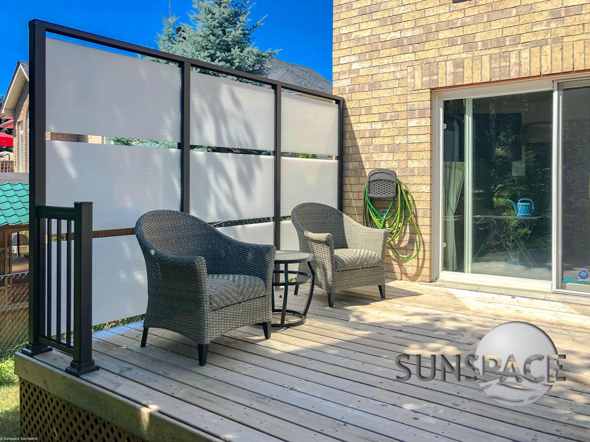 Les écrans d'intimité peuvent être utilisés pour les terrasses, les patios, les spas et comme clôtures. N'oubliez pas que nos murs d'intimité s'intègrent à bon nombre de nos autres produits, y compris les toitures de patio Sunspace et les garde-corps en verre lorsque l'intimité n'est pas un problème.